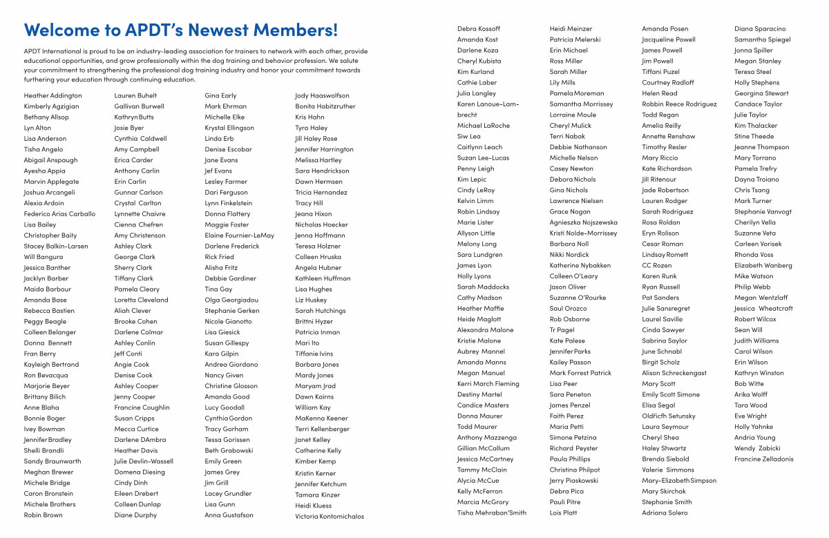 8 Better Training Through Education Welcome to APDT’ s Newest Members! APDT International is proud to be an industry-leading association for trainers to network with each other, provide educational opportunities, and grow professionally within the dog training and behavior profession. We salute your commitment to strengthening the professional dog training industry and honor your commitment towards furthering your education through continuing education. Heather Addington Kimberly Agzigian Bethany Allsop Lyn Alton Lisa Anderson Tisha Angelo Abigail Anspaugh Ayesha Appia Marvin Applegate Joshua Arcangeli Alexia Ardoin Federico Arias Carballo Lisa Bailey Christopher Baity Stacey Balkin-Larsen Will Bangura Jessica Banther Jacklyn Barber Maida Barbour Amanda Base Rebecca Bastien Peggy Beagle Colleen Belanger Donna Bennett Fran Berry Kayleigh Bertrand Ron Bevacqua Marjorie Beyer Brittany Bilich Anne Blaha Bonnie Boger Ivey Bowman Jennifer Bradley Shelli Brandli Sandy Braunwarth Meghan Brewer Michele Bridge Caron Bronstein Michele Brothers Robin Brown Lauren Buhelt Gallivan Burwell Kathryn Butts Josie Byer Cynthia Caldwell Amy Campbell Erica Carder Anthony Carlin Erin Carlin Gunnar Carlson Crystal Carlton Lynnette Chaivre Cienna Chefren Amy Christenson Ashley Clark George Clark Sherry Clark Tiffany Clark Pamela Cleary Loretta Cleveland Aliah Clever Brooke Cohen Darlene Colmar Ashley Conlin Jeff Conti Angie Cook Denise Cook Ashley Cooper Jenny Cooper Francine Coughlin Susan Cripps Mecca Curtice Darlene DAmbra Heather Davis Julie Devlin-Wassell Domena Diesing Cindy Dinh Eileen Drebert Colleen Dunlap Diane Durphy Gina Early Mark Ehrman Michelle Elke Krystal Ellingson Linda Erb Denise Escobar Jane Evans Jef Evans Lesley Farmer Dari Ferguson Lynn Finkelstein Donna Flattery Maggie Foster Elaine Fournier-LeMay Darlene Frederick Rick Fried Alisha Fritz Debbie Gardiner Tina Gay Olga Georgiadou Stephanie Gerken Nicole Gianotto Lisa Giesick Susan Gillespy Kara Gilpin Andrea Giordano Nancy Given Christine Glosson Amanda Good Lucy Goodall Cynthia Gordon Tracy Gorham Tessa Gorissen Beth Grabowski Emily Green James Grey Jim Grill Lacey Grundler Lisa Gunn Anna Gustafson Jody Haaswolfson Bonita Habitzruther Kris Hahn Tyra Haley Jill Haley Rose Jennifer Harrington Melissa Hartley Sara Hendrickson Dawn Hermsen Tricia Hernandez Tracy Hill Jeana Hixon Nicholas Hoecker Jenna Hoffmann Teresa Holzner Colleen Hruska Angela Hubner Kathleen Huffman Lisa Hughes Liz Huskey Sarah Hutchings Brittni Hyzer Patricia Inman Mari Ito Tiffanie Ivins Barbara Jones Mardy Jones Maryam Jrad Dawn Kairns William Kay MaKenna Keener Terri Kellenberger Janet Kelley Catherine Kelly Kimber Kemp Kristin Kerner Jennifer Ketchum Tamara Kinzer Heidi Kluess Victoria Kontomichalos