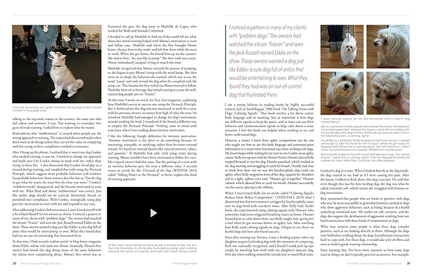 I like the following Google definition for intrinsic motivation:“ Intrinsic motivation is the drive to do something because it’ s interesting, enjoyable, or satisfying, rather than for some external reward. It’ s based on internal factors like natural interests, values, and passions.” If Mathilde had only tried using treats during training, Moose wouldn’ t have been motivated to follow her cues. His original owners had that issue. But the pairing of a treat with an intrinsic behavior gave the treat a different value. I recently wrote an article for the Chronicle of the Dog( WINTER 2023) called“ Adding Power to the Premack” to better explain this kind of training approach.