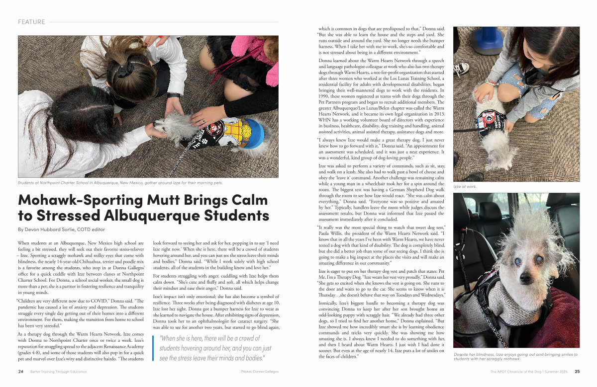 When students at an Albuquerque, New Mexico high school are feeling a bit stressed, they will seek out their favorite stress-reliever – Izze. Sporting a scraggly mohawk and milky eyes that come with blindness, the nearly 14-year-old Chihuahua, terrier and poodle mix is a favorite among the students, who stop in at Donna Gallegos’ office for a quick cuddle with Izze between classes at Northpoint Charter School. For Donna, a school social worker, the small dog is more than a pet; she is a partner in fostering resilience and tranquility in young minds.