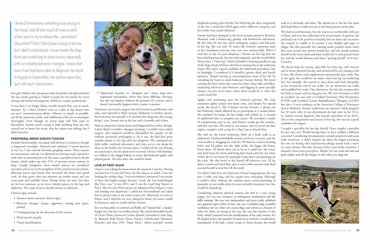 A year later, I no longer blame myself( scratch that: not as much, anyway). So, I share Emmie’ s story as a plea to dig deeper into our pets’ communication efforts. Observe as closely as possible, ask all the questions, probe, and collaborate with vets to investigate thoroughly. Even though we know dogs will hide pain or discomfort, Emmie wasn’ t trying to hide anything from me; she wanted me to know her secret, that her tumor was talking, but I didn’ t hear her.