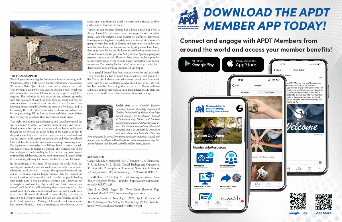 Rachel Brix is a Certified Behavior Consultant Canine- Knowledge Assessed and Certified Professional Dog Trainer- Knowledge Assessed through the Certification Council of Professional Dog Trainers and has been working with humans and their dogs over 15 years. She has both managed and volunteered at shelters and is an advocate for animals at both the local and state levels. Rachel has also been nominated for several Dog Writers Association of America Awards and this year won the Maxwell Medallion for her article on trauma in dogs. She lives in Missouri with her goofy, adorable, resilient rescue, Apache.