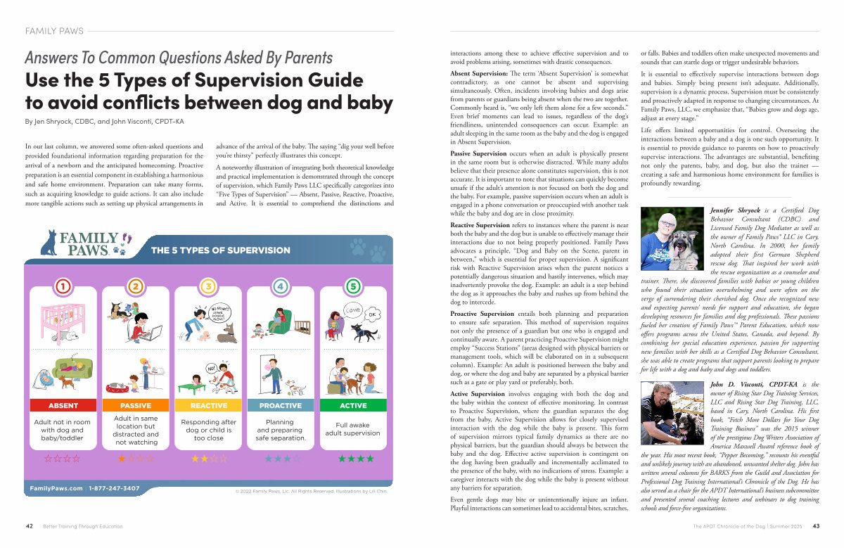 Proactive Supervision entails both planning and preparation to ensure safe separation. This method of supervision requires not only the presence of a guardian but one who is engaged and continually aware. A parent practicing Proactive Supervision might employ“ Success Stations”( areas designed with physical barriers or management tools, which will be elaborated on in a subsequent column). Example: An adult is positioned between the baby and dog, or where the dog and baby are separated by a physical barrier such as a gate or play yard or preferably, both.