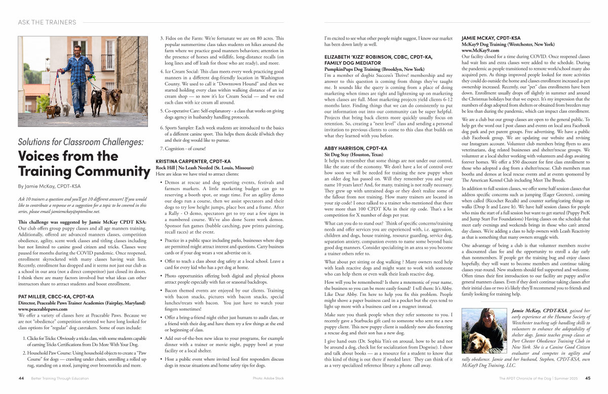 This challenge was suggested by Jamie McKay CPDT KSA: Our club offers group puppy classes and all age manners training. Additionally, offered are advanced manners classes, competition obedience, agility, scent work classes and titling classes including but not limited to canine good citizen and tricks. Classes were paused for months during the COVID pandemic. Once reopened, enrollment skyrocketed with many classes having wait lists. Recently, enrollment has dropped and it seems not just our club as a school in our area( not a direct competitor) just closed its doors. I think there are many factors involved but what ideas can other instructors share to attract students and boost enrollment.