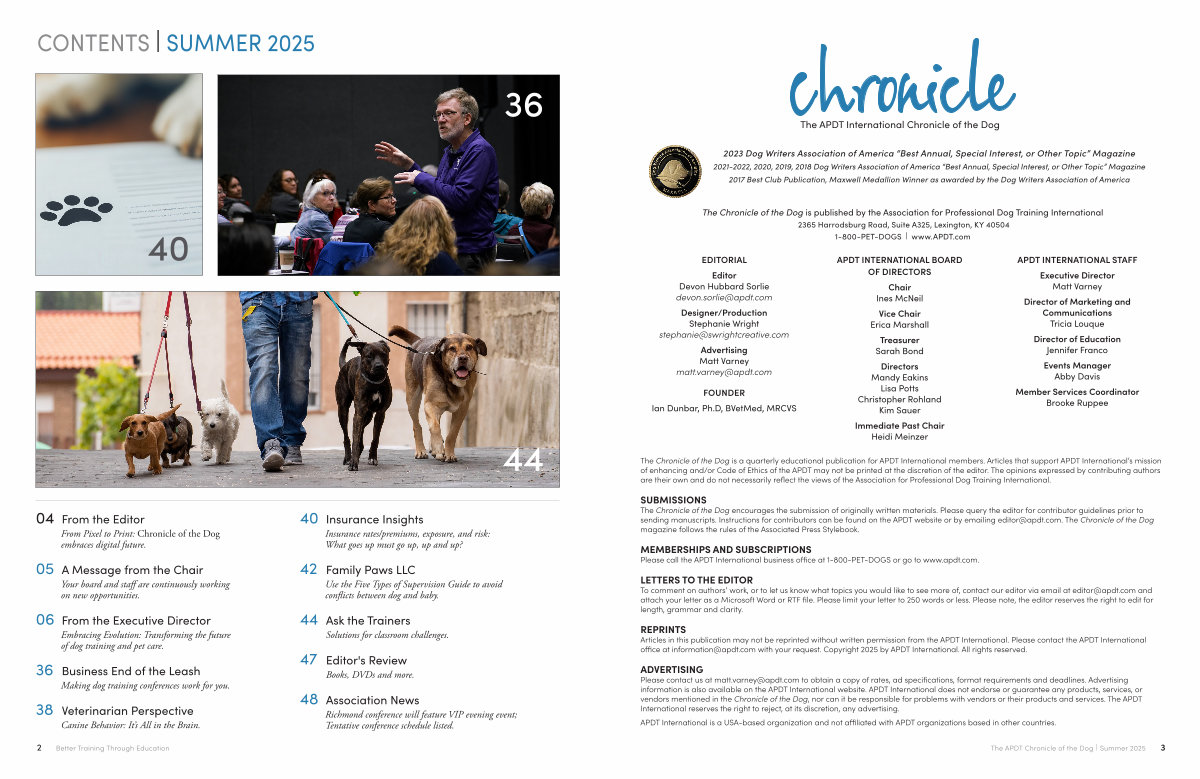 The Chronicle of the Dog is a quarterly educational publication for APDT International members. Articles that support APDT International’ s mission of enhancing and / or Code of Ethics of the APDT may not be printed at the discretion of the editor. The opinions expressed by contributing authors are their own and do not necessarily reflect the views of the Association for Professional Dog Training International.