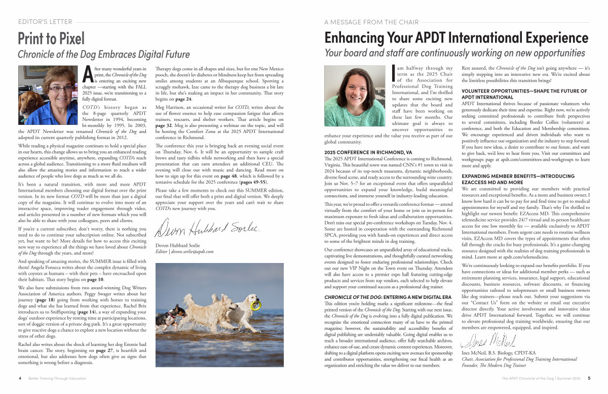 Meg Harrison, an occasional writer for COTD, writes about the use of flower essence to help ease compassion fatigue that affects trainers, rescuers, and shelter workers. That article begins on page 32. Meg is also presenting a webinar on the topic, and will be hosting the Comfort Zone at the 2025 APDT International conference in Richmond.