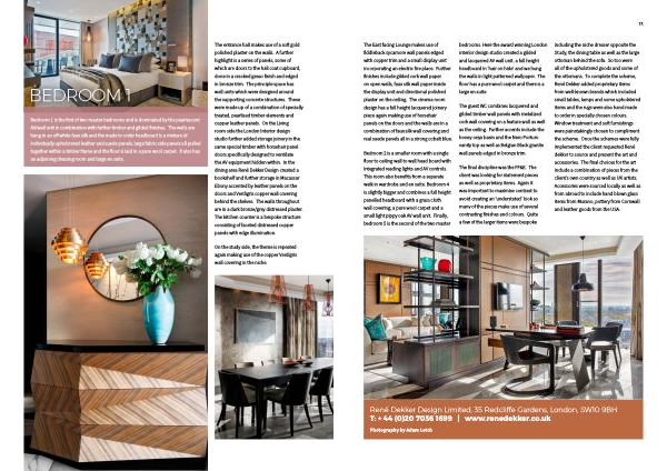 The entrance hall makes use of a soft gold polished plaster on the walls . A further highlight is a series of panels , some of which are doors to the hall coat cupboard , done in a cracked gesso finish and edged in bronze trim . The principle space has wall units which were designed around the supporting concrete structures . These were made up of a combination of specially treated , pearlised timber elements and copper leather panels . On the Living room side the London Interior design studio further added storage joinery in the same special timber with horsehair panel doors specifically designed to ventilate the AV equipment hidden within . In the dining area René Dekker Design created a bookshelf and further storage in Macassar Ebony accented by leather panels on the doors and Verdigris copper wall covering behind the shelves . The walls throughout are in a dark bronze / grey distressed plaster . The kitchen counter is a bespoke structure consisting of faceted distressed copper panels with edge illumination .