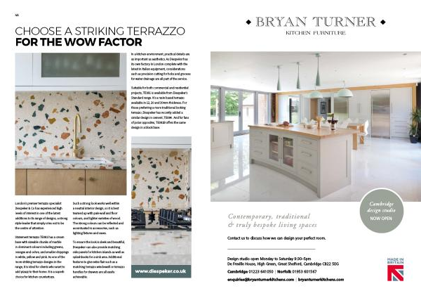 Suitable for both commercial and residential projects , TE081 is available from Diespeker ’ s Standard range . It ’ s a resin based terrazzo available in 12 , 20 and 30mm thickness . For those preferring a more traditional looking terrazzo , Diespeker has recently added a similar design in cement , TE084 . And for fans of polar opposites , TE081B offers the same design in a black base .