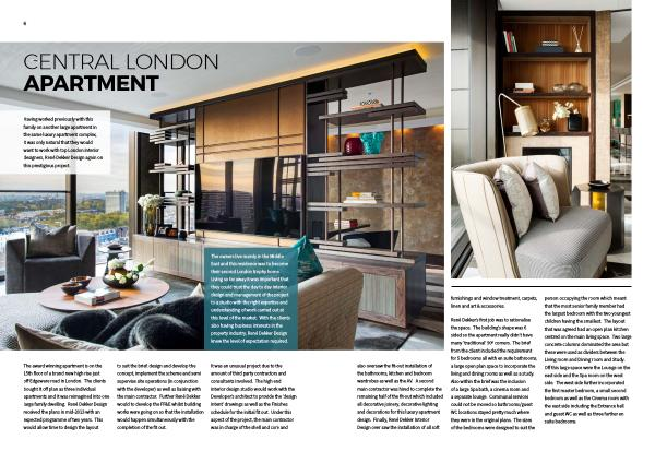 The award winning apartment is on the 15th floor of a brand new high rise just off Edgeware road in London . The clients bought it off plan as three individual apartments and it was reimagined into one large family dwelling . René Dekker Design received the plans in mid-2013 with an expected programme of two years . This would allow time to design the layout to suit the brief , design and develop the concept , implement the scheme and semi supervise site operations ( in conjunction with the developer ) as well as liaising with the main contractor . Further René Dekker would to develop the FF & E whilst building works were going on so that the installation would happen simultaneously with the completion of the fit out .