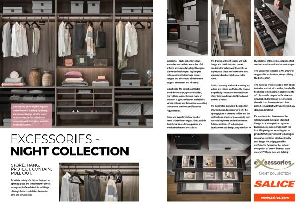 Excessories - Night Collection allows wardrobes and walk-in wardrobes of all styles to accommodate elegant hangers , scarves and tie hangers , bag hangers , cotton garment holder bags , trouser hangers and shoe racks , all elements of singular refinement and efficiency .