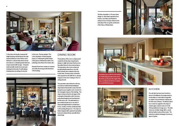 To the other side stands a bespoke full height shelving unit that frames the view towards Battersea Power Station and is finished in a natural steam beech veneer wood above a contrasting reeded dark red lacquer cabinet with storage . A bespoke sideboard with reeded doors and open shelving sits below the TV , with display shelving above providing a focal point in the room . Thomas explains “ The colour inspiration of these bespoke pieces is combining the golden beiges of the palace of Westminster with a rich pulsating colour that is the modern city ”.
