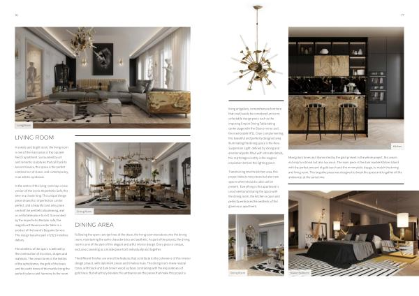 living art-gallery , comprehensive furniture that could easily be considered an iconic collectable design piece such as the imposing Empire Dining Table taking center stage with the Glance mirror and the memorable N ยบ 11 Chair complementing this beautiful and perfectly designed area . Illuminating the dining space is the Hera Suspension Light , defined by strong and emotional paths filled with intricate details , this mythological entity is the magical inspiration behind this lighting piece .
