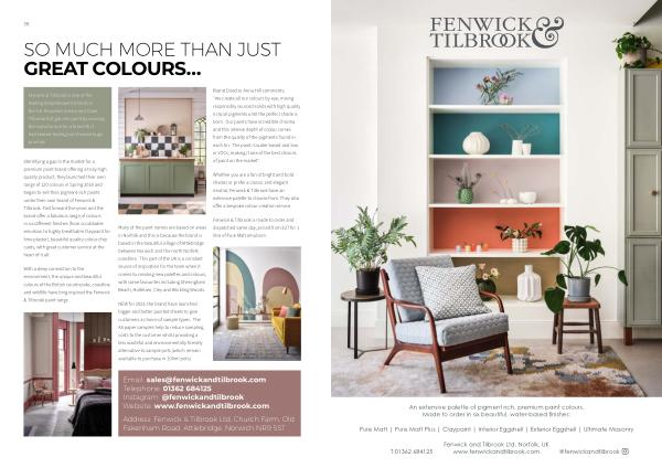Identifying a gap in the market for a premium paint brand offering a truly high quality product , they launched their own range of 120 colours in Spring 2018 and began to sell their pigment-rich paints under their own brand of Fenwick & Tilbrook . Fast forward five years and the brand offer a fabulous range of colours in six different finishes ( from scrubbable emulsion to highly breathable Claypaint for lime plaster ), beautiful quality colour chip cards , with great customer service at the heart of it all .