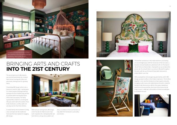 With a young family comes burgeoning personalities , which AMC Design was keen to reflect in the children ’ s bedrooms . The first floor daughter ’ s room sees the introduction of warm greens and pinks throughout , with a luxury net installed above the bed to create the feeling of a den-like structure . Whilst in the newly created boys ’ bedrooms on the second floor , their love of the cosmos and all things Jurassic is reflected in the addition of distinctive wallpaper to accented end walls .