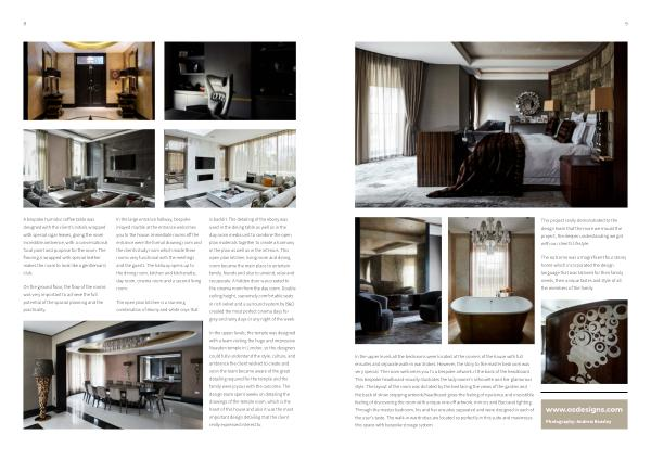 In the upper levels all the bedrooms were located at the corners of the house with full ensuites and separate walk-in wardrobes . However , the story to the master bedroom was very special . The room welcomes you to a bespoke artwork at the back of the headboard . This bespoke headboard visually illustrates the lady owner ’ s silhouette and her glamorous style . The layout of the room was dictated by the bed facing the views of the garden and the back of show stopping artwork / headboard gives the feeling of opulence and irresistible feeling of discovering the room with unique one-off artwork , mirrors and Baccarat lighting . Through the master bedroom , his and her ensuites separated and were designed in each of the user ’ s taste . The walk-in wardrobes are located so perfectly in this suite and maximises this space with bespoke storage system . www . osdesigns . com