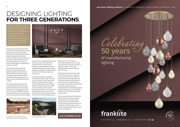 Franklite is celebrating a very prestigious milestone this year , its 50th year in the design , manufacture and distribution of high-quality decorative lighting . Over the years Franklite has manufactured exquisite products for the retail , commercial and hospitality markets including bespoke project designs .