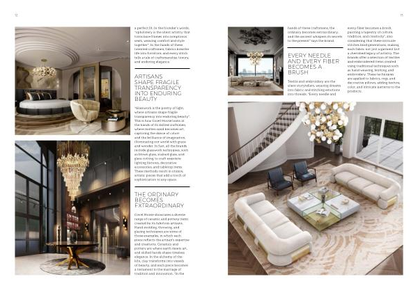 12 a perfect fit . In the founder ´ s words , “ upholstery is the silent artistry that turns bare frames into sumptuous seats , weaving comfort and style together ”. In the hands of these talented craftsmen , fabrics breathe life into furniture , and every stitch tells a tale of craftsmanship , luxury , and enduring elegance .