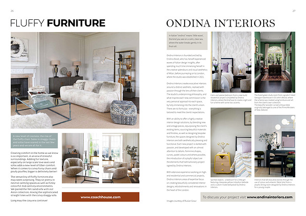 With an ability to offer a highly creative interior design solutions , by blending new and vintage pieces , repurposing the client ’ s existing items , sourcing beautiful materials and finishes , as well as designing bespoke furniture , the spaces designed by Ondina Interiors are both aesthetically pleasing and functional . Each new project is started with passion , and developed with an utmost attention to details . Feminine shapes , curves , pastel colours and where possible , the introduction of a playful object are the elements that hallmark every project signed by Ondina Interiors .