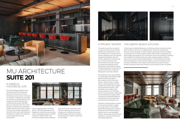 This captivating residential suite , envisioned by MU Architecture , derives its inspiration from the storied past of its location . Formerly occupied by Joe Beef , this erstwhile inn warmly welcomed laborers and seafarers from the bustling Port of Montreal during the mid-19th century . Revered as the “ Son of the People ,” this benevolent innkeeper transformed his tavern into a haven of solace and vibrant camaraderie . Suite 201 , built upon these historical foundations , endeavors to embody a welcoming and convivial atmosphere .