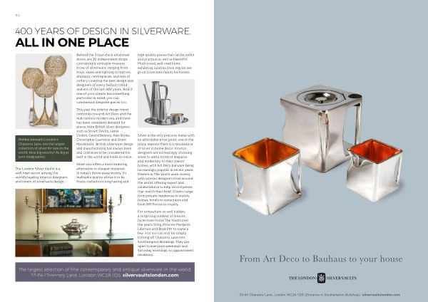 Silver is the only precious metal with an affordable price point , one of the many reasons there is a renaissance of silver in home décor . Interior designers are increasingly choosing silver to add a touch of elegance and modernity to their clients ’ homes , with Art Deco barware being increasingly popular in recent years . Dealers in The Vaults work closely with interior designers from around the world , offering expert and candid advice to help source pieces that match their brief . Clients range from private residences to stately homes , hotels to restaurants and from HM Forces to royalty .