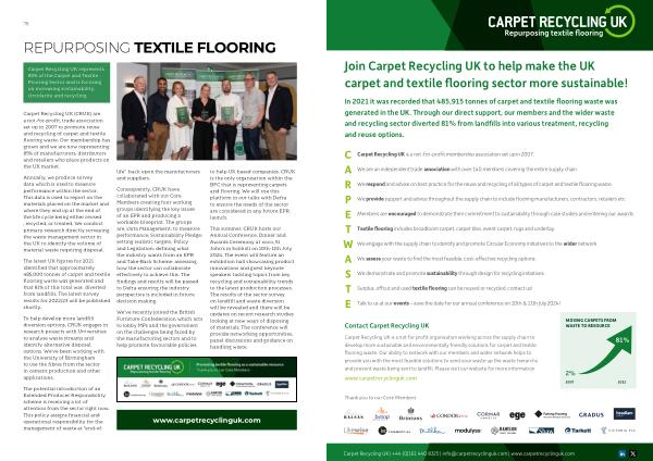 Carpet Recycling UK represents 85 % of the Carpet and Textile Flooring Sector and is focusing on increasing sustainability , circularity and recycling .