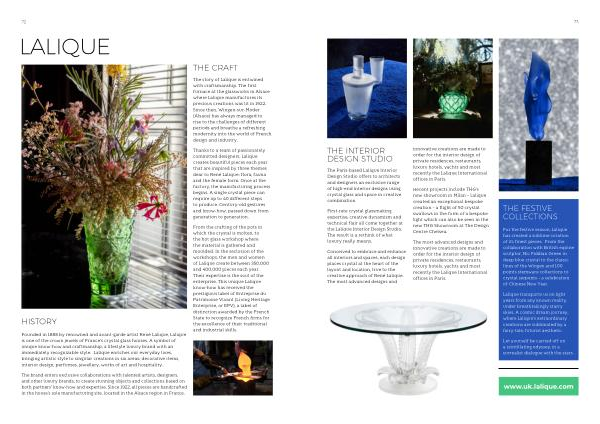 Thanks to a team of passionately committed designers , Lalique creates beautiful pieces each year that are inspired by three themes dear to René Lalique : flora , fauna and the female form . Once at the factory , the manufacturing process begins . A single crystal piece can require up to 40 different steps to produce . Century-old gestures and know-how , passed down from generation to generation .