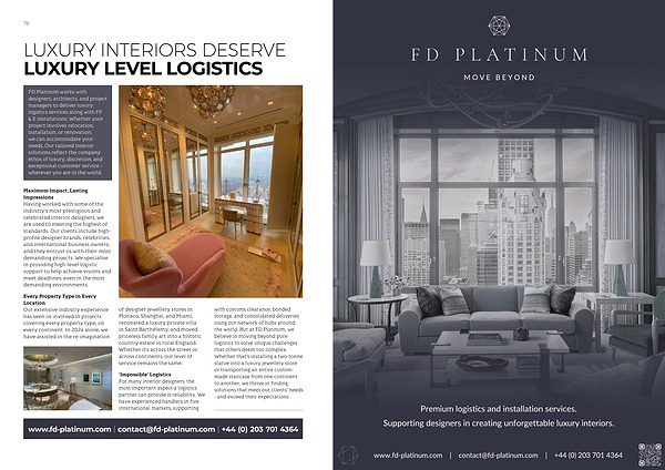 ‘ Impossible ’ Logistics For many interior designers , the most important aspect a logistics partner can provide is reliability . We have experienced handlers in five international markets , supporting with customs clearance , bonded storage , and consolidated deliveries using our network of hubs around the world . But at FD Platinum , we believe in moving beyond pure logistics to solve unique challenges that others deem too complex . Whether that ’ s installing a two-tonne statue into a luxury jewellery store or transporting an entire custommade staircase from one continent to another , we thrive in finding solutions that meet our clients ’ needs - and exceed their expectations .