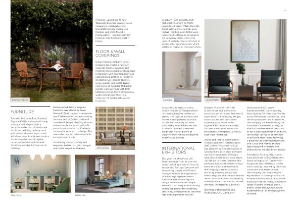 Distinguished British bespoke furniture manufacturer, Hyde House( C12) will launch its exquisite new Chelsea collection, epitomising the very best of British craft and considered design, blending sinuous shapes, tactile materials and soft pastel tones, inspired by Chelsea’ s maximalist approach to design. The new collection includes sides table, bar stools and a sofa.