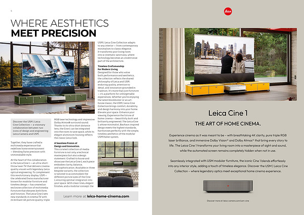 Seamlessly integrated with USM modular furniture, the iconic Cine 1 blends effortlessly into any interior style, adding a touch of timeless elegance. Discover the USM | Leica Cine Collection – where legendary optics meet exceptional home cinema experience.