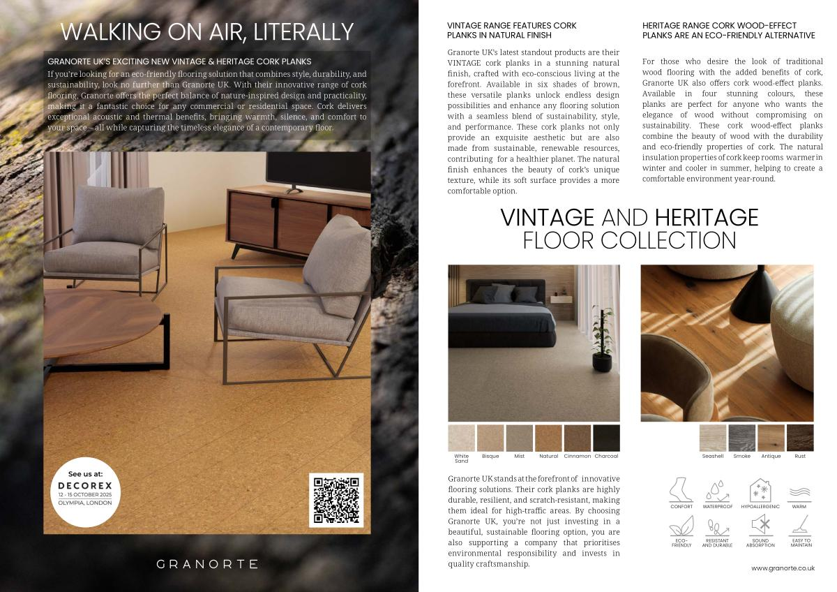 Granorte UK’ s latest standout products are their VINTAGE cork planks in a stunning natural finish, crafted with eco-conscious living at the forefront. Available in six shades of brown, these versatile planks unlock endless design possibilities and enhance any flooring solution with a seamless blend of sustainability, style, and performance. These cork planks not only provide an exquisite aesthetic but are also made from sustainable, renewable resources, contributing for a healthier planet. The natural finish enhances the beauty of cork’ s unique texture, while its soft surface provides a more comfortable option.