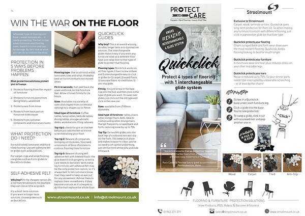 Exclusive to Stroolmount Carpet, wood, laminate or tiles: Quickclick gives long-term protection for them all. So when moving any furniture to a room with different flooring, just click in a protection glide for that floor type.