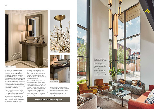 Together, these Contemporary designs celebrate Laura Hammett Living’ s ethos of balancing form, function, and material richness – delivering lighting that is as enduring as it is distinctive.