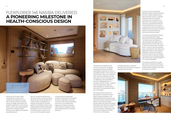 Driven by the Owners’ deep commitment to health and wellbeing, her bespoke interior sets a new benchmark in healthconscious design and reflects the builder’ s expertise in constructing highly custom long-range explorer yachts that combine unique features with capability, durability and performance.