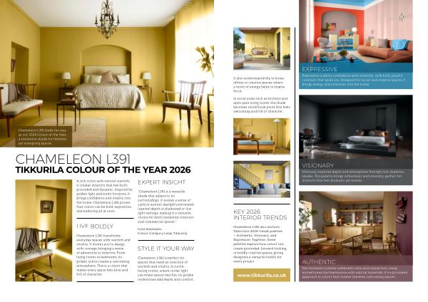 Chameleon L391 also anchors Tikkurila’ s 2026 trends palettes— Authentic, Visionary, and Expressive. Together, these palettes explore how colour can create grounded, forward-looking, or boldly creative spaces, giving designers a versatile toolkit for every project.