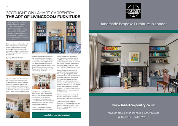Lahart Carpentry is a medium sized fitted furniture outfit that has been operating since 1999. They specialize in built-in furniture mainly in the North, North-West, West and South West areas of London and some surrounding areas. Aside from the living room furniture shown in this article, they install wardrobes, loft furniture, furniture for home offices, Built-in beds, children’ s bedrooms, under stairs areas etc.