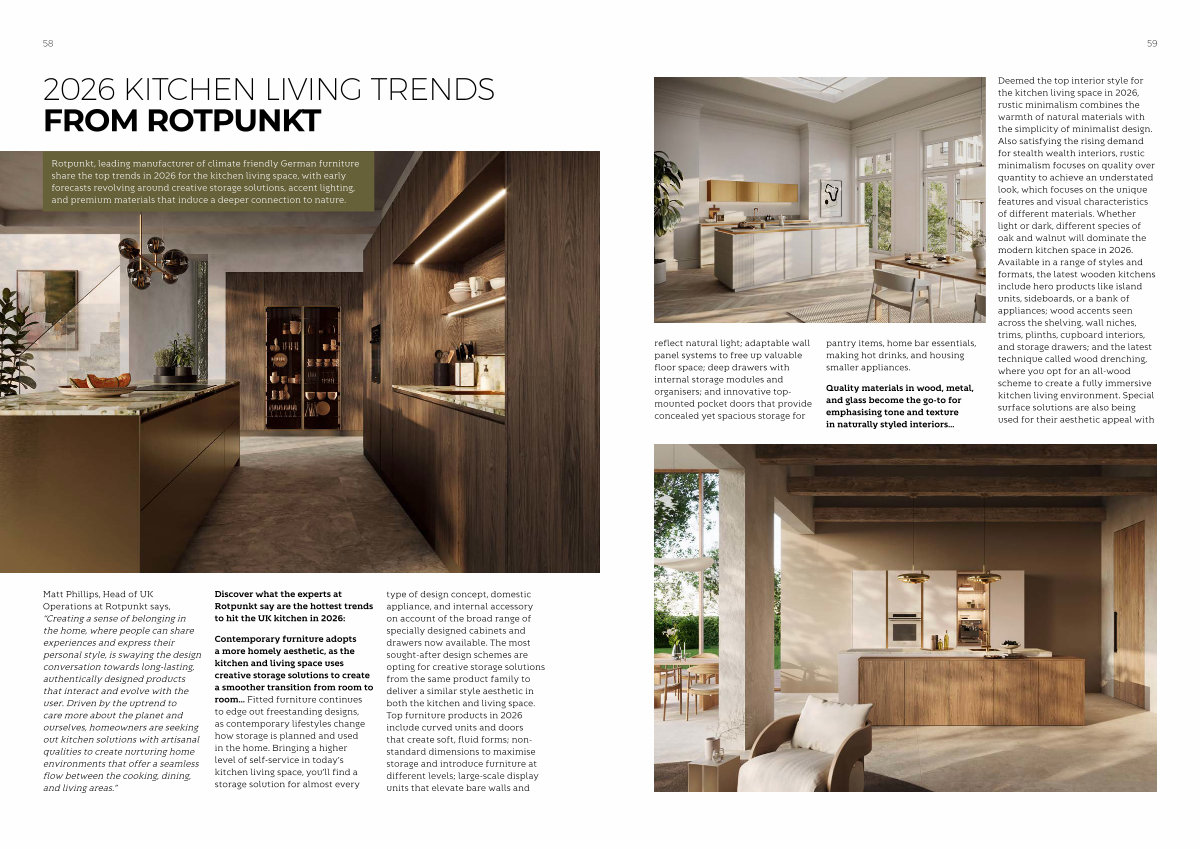 Deemed the top interior style for the kitchen living space in 2026, rustic minimalism combines the warmth of natural materials with the simplicity of minimalist design. Also satisfying the rising demand for stealth wealth interiors, rustic minimalism focuses on quality over quantity to achieve an understated look, which focuses on the unique features and visual characteristics of different materials. Whether light or dark, different species of oak and walnut will dominate the modern kitchen space in 2026. Available in a range of styles and formats, the latest wooden kitchens include hero products like island units, sideboards, or a bank of appliances; wood accents seen across the shelving, wall niches, trims, plinths, cupboard interiors, and storage drawers; and the latest technique called wood drenching, where you opt for an all-wood scheme to create a fully immersive kitchen living environment. Special surface solutions are also being used for their aesthetic appeal with