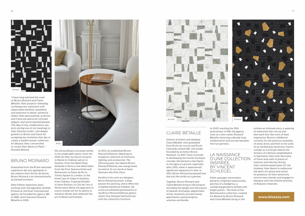 “ I have long admired the work of Bruno Moinard and Claire Bétaille. Their projects— blending contemporary classicism with impeccable aesthetic sensibility and attention to detail— perfectly reflect their personalities, as Bruno and Claire are above all cultured, elegant, and warm-hearted people. The idea of this collaboration was born during one of our meetings in their Parisian studio. I am deeply grateful to Bruno and Claire for accepting my invitation that day to create a marble mosaic collection for Bisazza. Now I am excited to unveil their décors in Paris.”- Rossella Bisazza