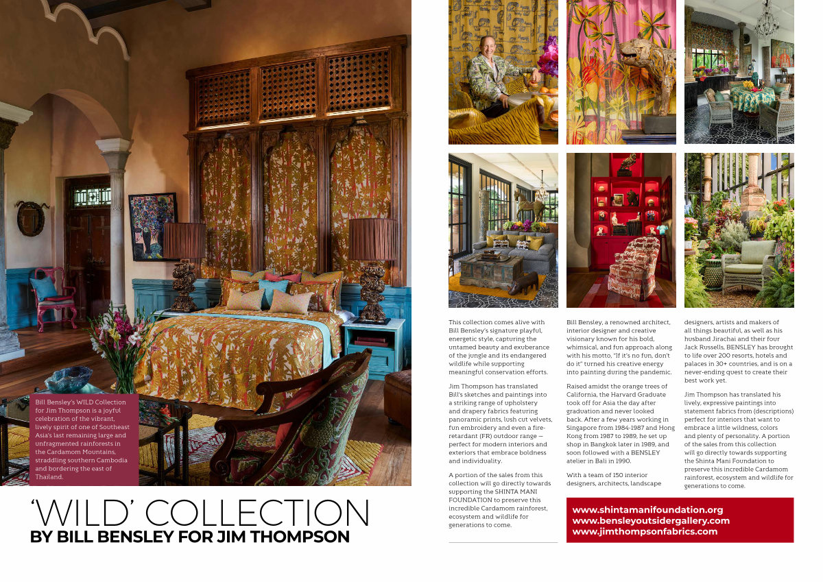 Jim Thompson has translated Bill’ s sketches and paintings into a striking range of upholstery and drapery fabrics featuring panoramic prints, lush cut velvets, fun embroidery and even a fireretardant( FR) outdoor range— perfect for modern interiors and exteriors that embrace boldness and individuality.