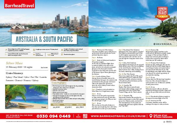Lifou Day 1: Fly from the UK to Sydney Our luxury chauffeur service will pick you up from your home and take you to your preferred departure airport. Day 2: En Route Day 3: Arrive in Sydney and transfer to 5* hotel for 2 nights. At the end of a marathon flight, there is renewed vitality in the cabin as the plane circles the city and gives passengers glimpses of the thousands of yachts suspended on the dark water and the sails of the famous Opera House glistening in the distance. Day 4: Lunch at Sydney Tower Among the most beautiful cities in the world, Sydney belongs to the exclusive club of destinations that generate excitement. Take in the sights from 250 meters above the city at Sydney Tower’s indoor observation deck. Day 5: Transfer to port and embark on Silver Muse for 14 night luxury cruise Day 6: At sea. Days at sea are the perfect opportunity to relax, unwind and catch up with what you’ve been meaning to do. Why not visit the onboard gym or spa? Day 7: At sea. Blue sea days are the perfect balance to busy days spent exploring shore side: find a peaceful area to catch up on your reading. Day 8: Pine Island, New Caledonia Nicknamed “the closest island to paradise” Pine Island is surrounded by some of the world’s brightest aquamarine blue water with tropical fish and coral that can be seen through the transparent waters of its lagoon. Day 14: Dravuni, Fiji. Think island paradise anywhere in the world and you will almost certainly conjure up images of Dravuni Island. Shallow limpid seas surround palm tree fringed beaches that encircle the whole island which has just 125 residents. Day 9: Lifou, New Caledonia Lifou Island is best known for its vast atoll which affords some of the best snorkelling in the world. Popular activities on the island include scenic walks, relaxing das on the beach, swimming and snorkelling. Day 16: Noumea New Caledonia. Guests can take a helicopter ride over the island and view the world’s largest lagoon, second largest barrier reef, tropical waters and mineral rich hills from the air. This breathtakingly scenic flight will also whisk over the port for a photo opportunity of the ship before landing. Day 10: Port Vila, Vanuatu. Due to its compact size, Port Vila can be easily explored in just a single day. Shore excursions available at this port include a Glass Bottom Boat Adventure and the Round Island Safari. Day 12: Lautoka, Fiji. Explore Fiji’s diverse natural beauty and ancient culture during a scenic and memorable visit to the Orchid Farm, Viseisei Village and the Vuda Lookout. Day 13: Sanusavu, Fiji. Spectacular Savusavu Bay provides the perfect environment to create Fiji’s natural gems, the J. Hunter pearls, renowned for their beautiful hues of soft pastels and exceptionally bold tones together with the rare “Fiji Gold”. WWW.BARRHEADTRAVEL.CO.UK/CRUISE Day 17: At sea. Pick up duty-free Silversea logo keepsakes from one of the onboard boutiques or spoil yourself at one of Silversea’s carefully curated partner stores. Day 18: At sea. Take some time to reflect on all you’ve experienced during your luxury voyage and relax on the pool deck with your favourite drink. Day 19: Disembark in Sydney, transfer to the airport for return flight to the UK Day 20: Arrive in the UK. Our luxury chauffeur service will be waiting at the airport to take you home. Visit one of our 76 Stores Nationwide