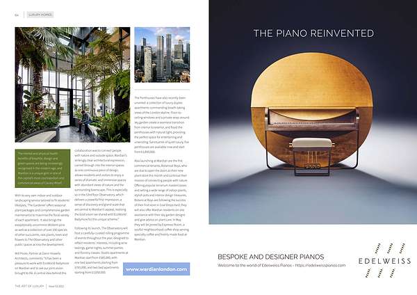 The Penthouses have also recently been unveiled : a collection of luxury duplex apartments commanding breath-taking views of the London skyline . Floor-toceiling windows and a private wrap-around sky garden create a seamless transition from interior to exterior , and flood the penthouses with natural light , providing the perfect space for entertaining and unwinding . Sanctuaries of quiet luxury , five penthouses are available now and start collaboration was to connect people from £ 1,850,000 . with nature and outside space ; Wardian ’ s strikingly clear architectural expression , Also launching at Wardian are the first carried through into the interior spaces commercial tenants , Botanical Boys , who as one continuous piece of design , are due to open the doors to their new allows residents and visitors to enjoy a plant store this month and continue their series of dramatic and immersive spaces mission of connecting people with nature . with abundant views of nature and the Offering popular terrarium masterclasses surrounding townscape . This is especially and selling a wide range of indoor plants , so in the 53rd floor Observatory , which stylish pots and interior design treasures , delivers a powerful first impression , a