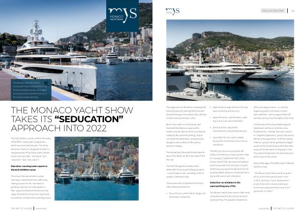 The 2022 edition is set to confirm the status of the MYS ’ s “ seducation ” programme , which was launched last year . This threeyear plan of action is designed to attract a new generation of yachting clients , thanks to two core concepts : “ education ” and “ seduction ” ( aka “ seducation ”).