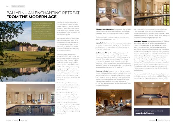 Massage at Ballyfin : Massage is one of the oldest and simplest forms of therapy and has been used for centuries to induce health and well-being , heal injury , relieve psychological stress , manage pain and improve circulation . Guests are invited to choose from a range of traditional techniques to a more specific customised massage designed especially for the guest ’ s needs whilst incorporating nature ’ s most advanced ingredient formulations for complete body wellness .