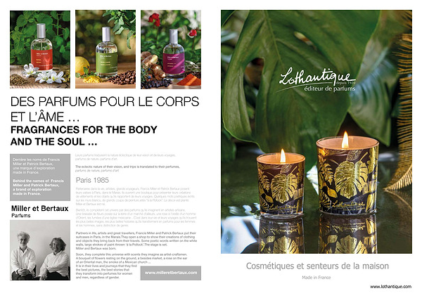 Soon , they complete this universe with scents they imagine as artist-craftsmen . A bouquet of flowers resting on the ground , a besides market , a rose on the ear of an Oriental man , the smoke of a Mexican church ... It is in their lives and journeys that they find the best pictures , the best stories that they transform into perfumes for women and men , regardless of gender . www . milleretbertaux . com