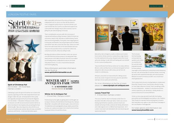 Celebrating 21 years the Spirit of Christmas Fair is back to full capacity supporting over 700 small independent brands and designer-makers this year , all handpicked for their quality and originality and approved by House & Garden Magazine . From 31 October – 6 November at Olympia London visitors can discover over 200 new and exclusive brands to the Fair as well as hundreds of returning favourites presenting the finest distinctive gifts . Many returning visitors share the Fair as an annual unmissable social calendar date and enjoy a wonderful experience with friends – to kick-start the festive season .