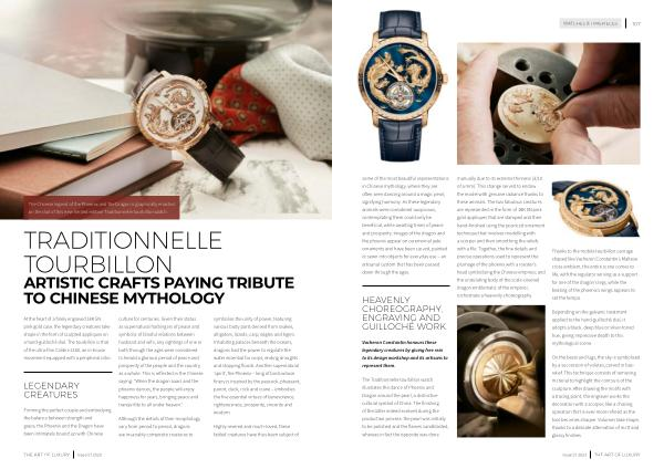The Traditionnelle tourbillon watch illustrates the dance of Phoenix and Dragon around the pearl , a distinctive cultural symbol of China . The finishing of the latter indeed evolved during the production process : the pearl was initially to be polished and the flames sandblasted , whereas in fact the opposite was done manually due to its extreme thinness ( 3 / 10 of a mm ). This change served to endow the model with genuine radiance thanks to these animals . The two fabulous creatures are represented in the form of 18K 5N pink gold appliques that are stamped and then hand-finished using the pounced ornament technique that involves modelling with a scorper and then smoothing the reliefs with a file . Together , the fine details and precise operations used to represent the plumage of the phoenix with a rooster ’ s head symbolising the Chinese empress ; and the undulating body of the scale-covered dragon emblematic of the emperor , orchestrate a heavenly choreography .