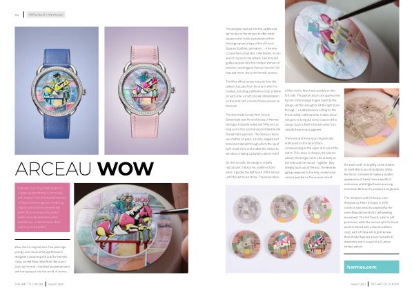 This timepiece with its Arceau case designed by Henri d ’ Origny in 1978 comes in two versions powered by the same Manufacture H1912 self-winding movement . The first flaunts a dial in soft pink tones , while the second opts for bluish accents . Paired with a Hermès calfskin strap , each of these white gold Arceau Wow model features a bezel set with 82 diamonds and is issued in a 24-piece limited edition .