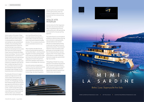 “ At the inception of this project , Tillberg Design of Sweden worked very closely with the Marc-Henry team and Four Seasons , in analysing extensive market research , and creating a very clear and solid brand manifesto . As we are building a whole new guest experience from scratch , this document has been instrumental as a guidance for the development of our entire yacht , which has turned out distinctly unique ,” said Larry Pimentel , CEO of Marc- Henry Cruise Holdings . “ The iconic , timeless and beautiful exterior is also the work of TDoS , and they have since master planned the whole vessel , designed all the guest suites , and some of the prime public areas onboard . Our collaboration with TDoS has been incredibly inspiring and fruitful . As our lead architects , they have once again demonstrated their passion and deep knowledge of high-end design , from the broad strokes down to the finest details .”