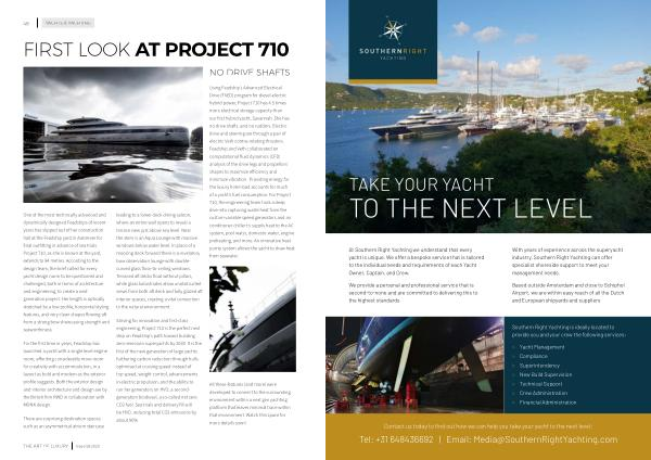 Striving for innovation and first-class engineering , Project 710 is the perfect next step on Feadship ’ s path toward building zero-emission superyachts by 2030 . It is the first of the new generation of large yachts furthering carbon reduction through hulls optimised at cruising speed instead of top speed , weight control , advancements in electric propulsion , and the ability to run her generators on HVO , a secondgeneration biodiesel , a so-called net zero CO2 fuel . Sea trials and delivery fill will be HVO , reducing total CO2 emissions by about 90 %