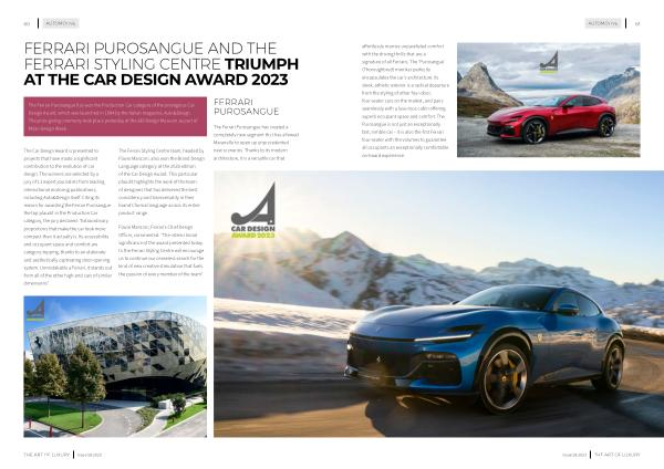 The Car Design Award is presented to The Ferrari Styling Centre team , headed by projects that have made a significant Flavio Manzoni , also won the Brand Design contribution to the evolution of car Language category at the 2023 edition design . The winners are selected by a of the Car Design Award . This particular jury of 11 expert journalists from leading plaudit highlights the work of the team international motoring publications , of designers that has delivered the best including Auto & Design itself . Citing its consistency and transversality in their reason for awarding the Ferrari Purosangue brand ’ s formal language across its entire the top plaudit in the Production Car product range . category , the jury declared : “ Extraordinary proportions that make the car look more Flavio Manzoni , Ferrari ’ s Chief Design compact than it actually is . Its accessibility Officer , commented : “ The international and occupant space and comfort are significance of the award presented today