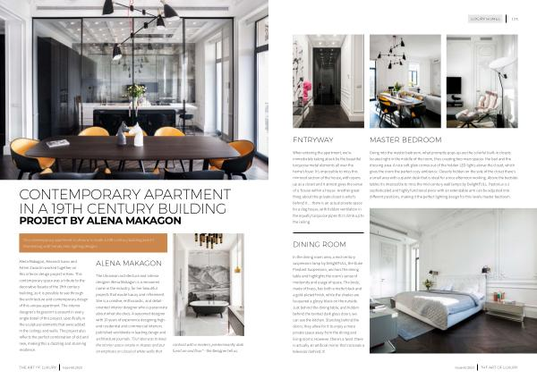 The Ukrainian architecture and interior designer Alena Makagon is a renowned name in the industry , for her beautiful projects that exude luxury and refinement . She is a creative , enthusiastic , and detailoriented interior designer who is passionate about what she does . A seasoned designer with 10 years of experience designing highend residential and commercial interiors published worldwide in leading design and architecture journals . “ Our idea was to keep the interior space simple in shapes and put an emphasis on classical white walls that contrast with a modern , predominantly dark furniture and floor .” - the Designer tell us .