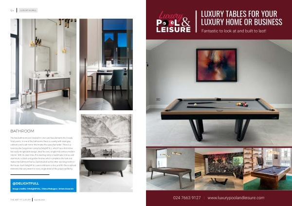 The two bathrooms are covered in colors and key elements that create focal points . In one of the bathrooms there is a vanity with sleek gray cabinetry and a tall mirror that makes the space feel wider . There is a luxurious Ike Suspension Lamp by DelightFULL , which has a distinctive but easily recognizable design , ideal for every single mid-century modern interior . With its clean lines , this dazzling lamp is handmade in brass and aluminum , in black and golden finishes which completes the look and makes the bathroom feel as sophisticated as the other stunning rooms in the house . Each DelightFULL piece embraces a story and fits the sculptural elements that are present in every single detail of this project perfectly .